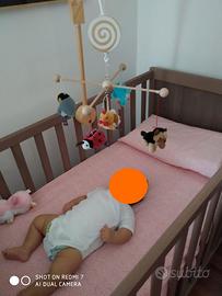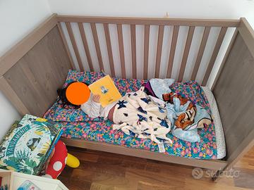 Lettino Ikea modello Sundvik, colore legno effetto rovere. Si tratta di un lettino che cresce insieme al bambino, permettendone l'uso fin dalla nascita (con il materasso rialzato), abbassando il materasso quando comincia a stare in piedi ed eliminando una sponda quando comincia a camminare (il letto è abbastanza basso da permettere l'ingresso e l'uscita in autonomia).