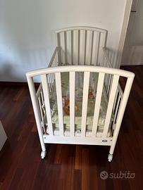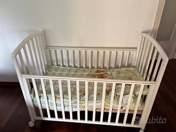 Vendo lettino per bambini marca Pali, struttura in legno colore bianco, in buone condizioni generali. Il lettino è dotato di ruote per spostarlo facilmente ed è completo di materasso. Insieme regalo anche il coordinato tessile visibile in foto. Presenta normali segni d’uso, ma è ancora bello e pronto da utilizzare. Ideale per cameretta o casa dei nonni.
