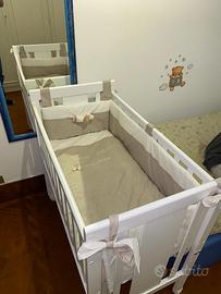 Vendo lettino mini-me marca Nanan con materasso paracolpi e piumone sempre marca Nanan (piumone mai utilizzato) ha anche le cinghie per legarlo al letto per tenere il bambino di fianco al letto dei genitori.