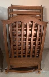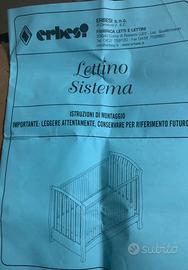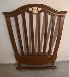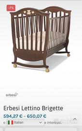Lettino della linea Erbesi , composto da due spondine regolabili in due posizioni , rete a doghe, cassetto e quattro ruote di cui due con freni. Kit dondolo incluso.