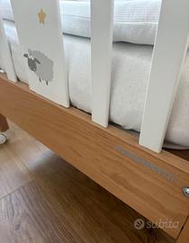 Il lettino è in legno bicolore bianco e color legno naturale Foppapedretti linea pekos con una cassettiera sotto e barra laterale a due altezze.