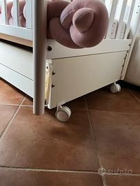 La culla è in buone condizioni. È dotata di un cassetto estraibile per riporre la biancheria da letto. È dotata di un meccanismo a dondolo. Ruote bloccabili. Il materasso non è incluso.