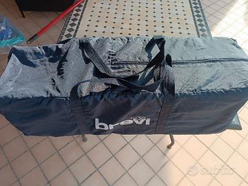 lettino da campeggio brevi colore blu e arancio dotato di due ruote per spostarlo agilmente, completamente richiudibile in apposita borsa.