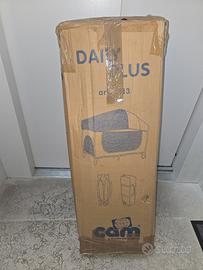 Lettino da campeggio CAM Daily Plus comodo e pratico, dotato di una chiusura compatta, con fasciatoio e borsa da viaggio inclusi. Praticamente nuovo usato solo in 2 vacanze, esattamente come da foto: Misura da aperto: L 128,5 – P 73 – H 117 cm, dotato di una chiusura compatta (L 22,5 – P 21 – H 79 cm). Il lettino da campeggio Daily Plus è facile da trasportare con la sua borsa viaggio e 2 ruote con freno. Dotato di fasciatoio, kit doppia altezza, capottina con peluches removibili, zanzariera, ampia tasca portaoggetti, finestra con zip. Se interessati ho anche materasso da viaggio pieghevole da acquistare a parte 20 euro, anche questo con borsa da viaggio.