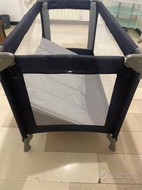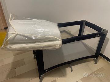 Lettino da campeggio Mon Bebè, colore blu come nuovo. Regalo piumino, materasso in gomma piuma e cuscino.