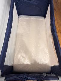 Vendo lettino da campeggio Chicco, colore blu, apertura laterale con cerniera, materassino del kit e ulteriore materasso ergonomico per neonati alto 11 cm incluso.