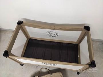 Lettino da campeggio 60x120 con materassino, eventualmente ho un materasso più spesso. Il lettino presenta una sponda che non si incastra bene ma funziona comunque.
