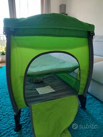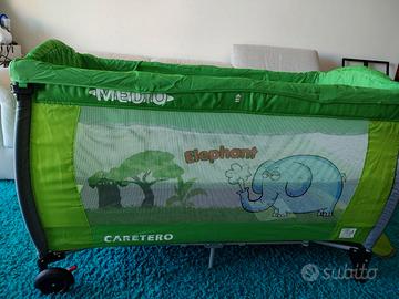 Lettino da neonato/bambino portatile (anche adatto per il campeggio) che si richiude in pochissimo spazio. Marca Caretero, modello Elephant. Numerosi accessori: rialzo per neonati, fasciatoio, zanzariera, tasca portaoggetti. Porta per ingresso ed uscita autonoma. Incluso materasso 120x60. Ruote per trasporto facilitato.