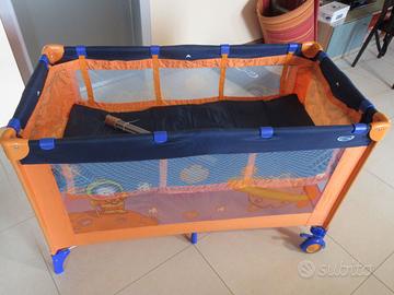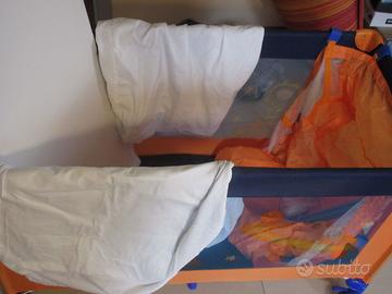 Lettino da viaggio pieghevole, marca Giordani, con materasso aggiuntivo di misura, telo salvamaterasso e coprimaterasso lavabile.