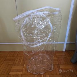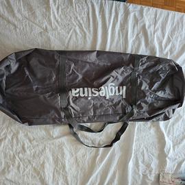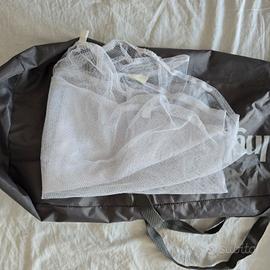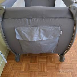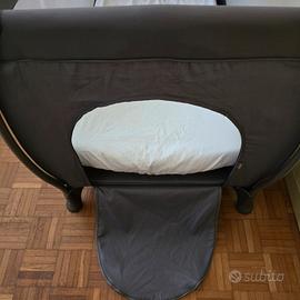 Lettino da viaggio 120X70 circa, colore grigio, comodo da trasportare nella sua sacca con maniglie, sistema doppia altezza per quando il bimbo è molto piccolo, sacca laterale portaoggetti, oblò laterale per entrare e uscire in autonomia, materasso compreso e dotato della sua confezione di plastica per il trasporto, zanzariera per protezione insetti.