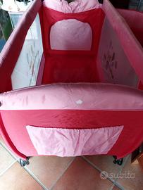 mai usato richiudibile provvisto di vari accessori dal carillon alle tasche al fasciatoio tutto smontabile di colore rosa/rosso.