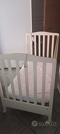 Tenuto molto molto bene. Colore panna, con ruote bloccanti, materasso, coprimaterasso, cassettone e due sbarre.