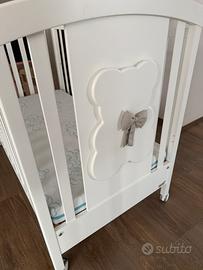 Il lettino Dudù è realizzato in legno massello di faggio, con sponde regolabili in altezza e un ampio e comodo cassetto. É caratterizzato da 4 ruote piroettanti con gomma antitraccia, di cui due con freno. É dotato di un' applicazione a forma di orsetto con fiocco, ed è disponibile in quattro diversi colori: bianco tortora, bianco grigio, tortora sbiancato e grigio sbiancato. Il design e la produzione sono Made in Italy.