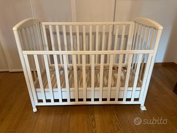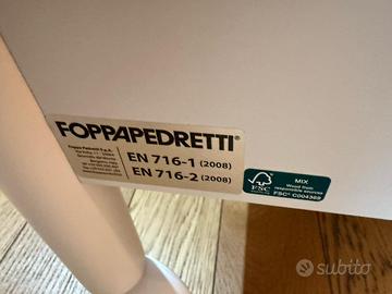 Lettino in legno di colore bianco Foppapedretti con sponda regolabile a due altezze e rete a doghe. Il lettino ha un ampio cassetto inferiore, suddiviso in due scomparti e ruote con sistema frenante per facilitare gli spostamenti. La struttura è verniciata con vernici atossiche ed è 100% made in Italy. Dimensioni cm: H 108 | P 73 | L 131 Bagnetto fasciatoio in legno di colore bianco Foppapedretti trasformabile in comoda cassettiera, dotato di vaschetta per il bagnetto estraibile, piano ribaltabile pe pratico materassino sostituibile. Ha ruote gommate antigraffio, con sistema frenante, per facilitare gli spostamenti. 100% made in Italy. Dimensioni aperto cm: H 131 | P 50 | L 69 Dimensioni chiuso cm: H 89 | P 47 | L 69