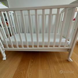 Cassettiera in legno bianco con 5 cassetti e lettino con materasso, spondine laterali con altezza modificabili e cassetto porta oggetti