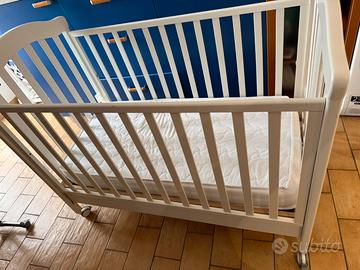 Il lettino è completo di materasso in più forniamo un materasso di ricambio, sponde in legno con due misure di altezza, ruote con sistema frenante, sistema secur-baby, rete ortopedica a doghe in legno.