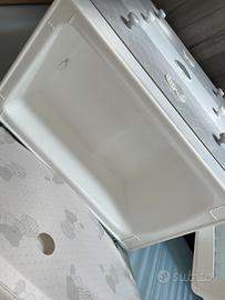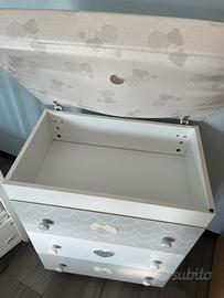Il bagnetto fasciatoio è trasformabile in comoda cassettiera. È dotato di vaschetta per il bagnetto estraibile, piano ribaltabile con sistema di sicurezza ammortizzato e pratico materassino.