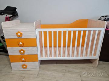 Lettino con fasciatoio frontale e 5 cassetti. Molto comodo avendo il fasciatoio frontale. Sbarra laterale del lettino che si alza e abbassa. Lo vediamo smontato, solo la cassettiera è montata. Ritiro a carico dell'acquirente.