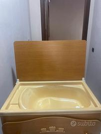Lettino con cassetto e sponda regolabile in altezza, completo di materasso. Fasciatoio con vaschetta per bagnetto e quattro cassetti