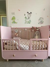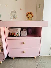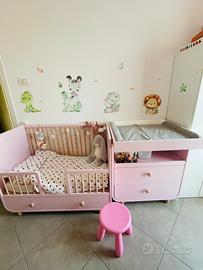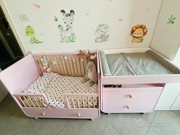 Lettino con cassetto 60x120. La base del lettino è regolabile in tre altezze diverse sponda di protezione alta per neonato a corredo. Fasciatoio rosa 85x80 con materassino e copri fasciatoio incluso. La parte frontale si può smontare.