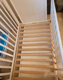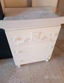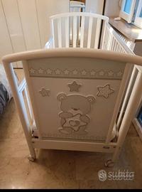 Vendo Cameretta BIRBA di PALI tenuta benissimo colori bianco e grigio con orsetti decorativi come da foto, composta da: LETTINO (132 x 72 x 101 cm) con 1 sponda mobile in legno di faggio massello; rete a doghe in legno di faggio regolabile in due posizioni, vernici atossiche; 4 ruote piroettanti con freno, cassettone, utilizzabile da entrambi i lati. MATERASSO IN FIBRA BAMBOO (124 x 62 x 11 cm) antiacaro ed antibatterico. Sfoderabile e lavabile sia a mano che in lavatrice a 30 gradi. FASCIATOIO con bagnetto (76 x 45 x 90 cm): dotato di materassino a 2 lati sfilabile, con sponde di sicurezza; 4 ruote piroettanti con freno; 3 ampi cassetti (1 macchiato internamente di olio), su guide metalliche scorrevoli; coperchio ribalta con blocco di sicurezza. Inserite staffe di rinforzo interne. Ritiro a Collegno Torino