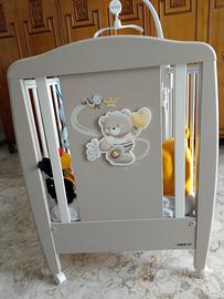 Lettino CAM con orso e luna, con sponde e cassetto, completo di coordinato CAM "orso", ovvero paracolpi, piumino e trapuntina.