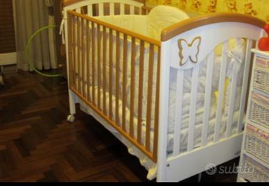 Lettino bimbo in legno con ruote – ottime condizioni compreso di paracolpi e piumino coordinato