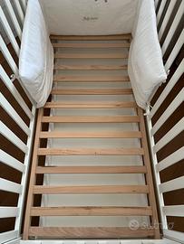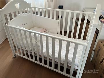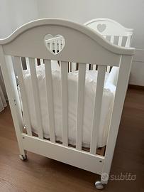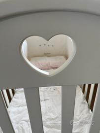 Lettino Erbesi dolce bianco con cuore. Misure 73x134 altezza 108 cm. Lettino con struttura in legno e con ampio cassetto, 4 ruote piroettanti con gomma antitraccia di cui due con freno. Entrambe le sponde sono mobili con il sistema di movimento secur-baby azionabile in due movimenti susseguenti. Vendo per inutilizzo. Insieme al lettino cedo il materasso.
