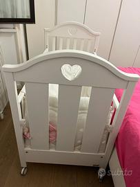 Vendo lettino modello Erbesi Dolce bianco dal design elegante e funzionale, realizzato in legno di faggio e con vernici atossiche. E' dotato di rete ortopedica con doghe in legno. Le 4 ruote di cui 2 frenanti consentono di spostarlo facilmente in ogni zona della cameretta. Realizzato rispettando la distanza di sicurezza delle stecche (meno di 6 cm) e con angoli completamente smussati. Perfettamente funzionante. Vendo completo di tutto (materasso - copertine). Le misure sono: L 134,5 x P 75 x 108,5 cm.