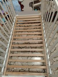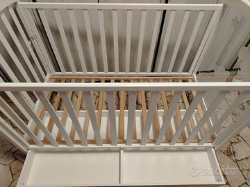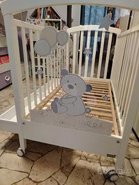Lettino con sbarre Erbesi, usato ma in buone condizioni, qualche segno di usura, si vende con materasso(sfoderabile) e casetto porta biancheria