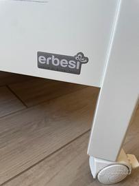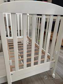 Lettino con struttura in legno massello di faggio. Ampio cassetto, 4 ruote piroettanti con gomma antitraccia di cui due con freno. Entrambe le sponde sono mobili con il sistema di movimento secur-baby azionabile in due movimenti susseguenti. Kit alzata rete incluso.
