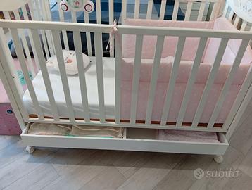 Lettino a sbarre bimbi 0/3 anni Erbesi, ottima qualità e resistenza, presenta ruote, cassetto x lenzuola/ copertine, un lato è regolabile di altezza, in ottimo stato. Eventualmente è disponibile anche il fasciatoio abbinato, la mia bimba ha 3 anni e lo sto ancora utilizzando per l'abbigliamento. Disponibili altri accessori su richiesta.