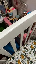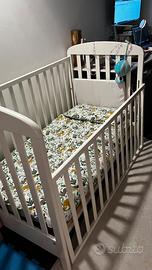 Vendo lettino Erbesi linea “Nido”, doghe in legno, con cassetto sotto, completo di materasso in memory foam e due cuscini, sempre in memory foam uno basso e uno piu alto. Completo la vendita con copri materasso idrorepellente, un piumino, il set copri piumino in foto, un set della caleffi con trapunta lenzuolo sopra e sotto e federa con disegnato minnie e topolino, altri 4 set lenzuola completi. Posso inviare le foto del resto . Un paio di segni come da foto. Prezzo trattabile