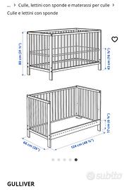Lettino montessoriano evolutivo da 0 a 3 anni. Ikea Gulliver con 3 possibilità di disposizione, completo di materasso in lattice Ikea Vyssa. Materasso in ottime condizioni usato sempre con coprimaterasso impermeabile. Lettino con qualche piccolo segno di uso. Includo piumino e n.2 set completi (lenzuolo con angoli+copripiumino+federa Ikea). Già smontato pronto per trasporto.