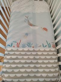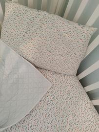In regalo paracolpi della stessa collezione, con bordo da ricucire e sette paia di lenzuola (federa, lenzuolino con elastici e lenzuolino superiore)
