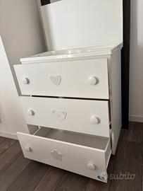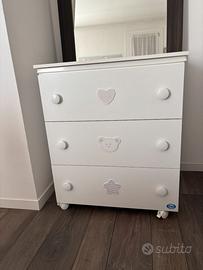 Lettino con cassettone e due diverse altezze del materasso (compreso)+ fasciatoio con vaschetta marca Pali. Ben tenuti. Oltre paracolpi Prenatal e piumone con federa marca Pali. Presente piccola macchia all’interno dell’ultimo cassetto del fasciatoio.