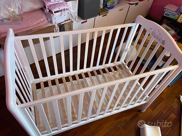 Vendo Lettino Foppapedretti Felicity. Dimensioni:131x73x103 cm. Struttura In legno di faggio verniciato con colori atossici.dotato di una sponda regolabile in due posizioni ed una fissa.rete regolabile a due altezze.un ampio cassetto e ruote gommate con freno. Le testate hanno decorazioni con orsetti. Tenuto benissimo, con un segnetto. É disponibile anche materasso ad hoc.Il lettino compreso il materasso è in vendita a 100€