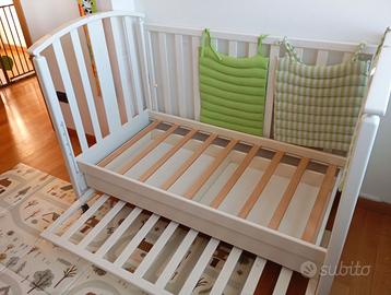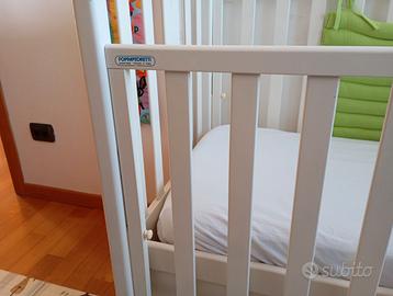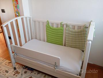 Lettino in legno Foppapedretti con una sponda regolabile a tre altezze fino alla possibilità di nasconderla sotto la rete a doghe e cassetto inferiore. Il lettino lo abbiamo usato dai 9 mesi fino praticamente ai 3 anni, in quanto molto flessibile. Lo abbiamo integrato anche con una piccola sponda Ikea, removibile, per quando la bambina era già autonoma a scendere e salire. Il letto è smontato e si monta con solo 4 viti. Volendo diamo anche i materassi, uno invernale e uno estivo con 30 euro in più. Prodotto molto valido.