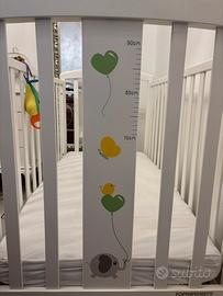 Lettino Foppapedretti in legno laccato bianco, con sponda abbassabile, cassetto contenitore e disegno metro per altezza bambini