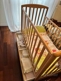 Lettino in legno con cassettone, completo di materasso completamente sfoderabile, cuscino e piumone. Con due set di lenzuola copripiumone.