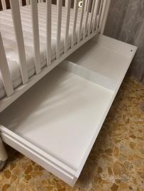 Lettino in legno modello Patty di Foppapedretti con sponda regolabile, rete a doghe regolabile a due altezze e ampio cassetto inferiore, suddiviso in due scomparti, ruote gommate antigraffio, con sistema frenante.