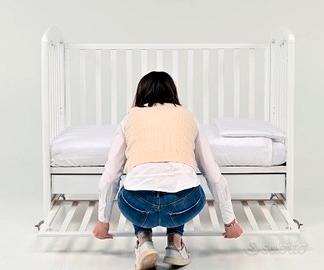 Il lettino in legno di Foppapedretti ha una sponda regolabile a 2 altezze, per facilitare il riordino del lettino, che può anche essere abbassata a scomparsa per trasformarlo in un comodo divanetto.