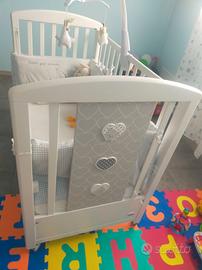 Anche la rete è regolabile a due altezze, per consentire un pratico uso anche quando il bimbo è neonato. Una delle testate del lettino ha decorazioni con teneri cuori e un dolcissimo orsetto.