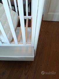 tenuto benissimo, bianco con orsetto beige. cassettone inferiore, sponda a due altezze, rete in doghe posizionabili a due altezze. materasso Foppapedretti compreso. Possibilità di avere kit paracolpi Foppapedretti e completo lenzuola e piumone sempre con la stessa grafica.