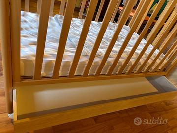 Lettino Foppapedretti usato pochissimo. Sponda regolabile a due altezze e rete a doghe regolabile a due altezze. Il lettino ha un ampio cassetto inferiore e ruote con sistema frenante per facilitare gli spostamenti.