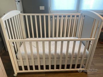 Lettino Foppapedretti Lovely in legno bianco con decorazioni grigie. Ottime condizioni. Rete regolabile a due altezze, sponda removibile. Cassetto inferiore con due scomparti, ruote gommate con sistema frenante. Si vende con incluso