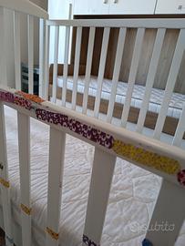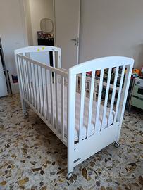 Lettino Foppapedretti modello Lovely con spondina regolabile. Unico difetto buco sul cassetto destro. Completo di materasso.