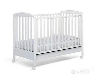 4 ruote gommate piroettanti di cui 2 con freno rendono agevole lo spostamento; ampio cassetto per riporre la biancheria del lettino