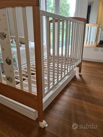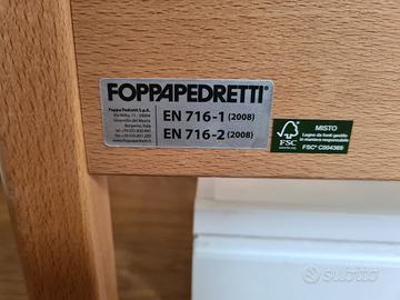 Struttura in legno massiccio di faggio verniciato, rete reggimaterasso in legno di faggio, cassetto in truciolare nobilitato, verniciato con colori atossici, ruote in nylon.