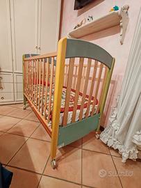 Lettino Foppapedretti gioioso con cassetto e varie lenzuola e copripiumino.